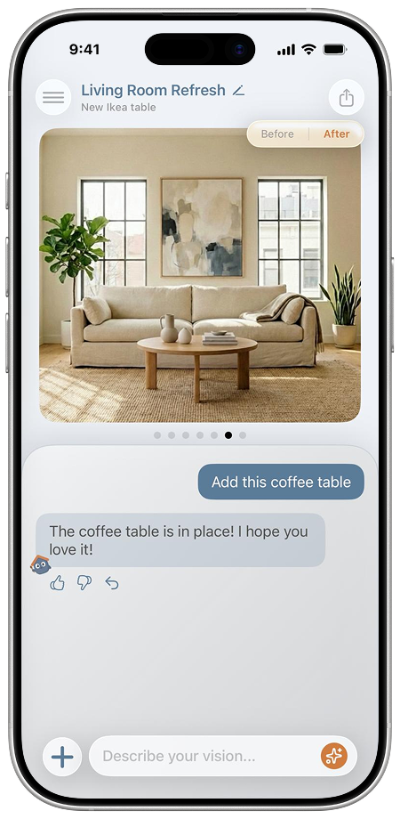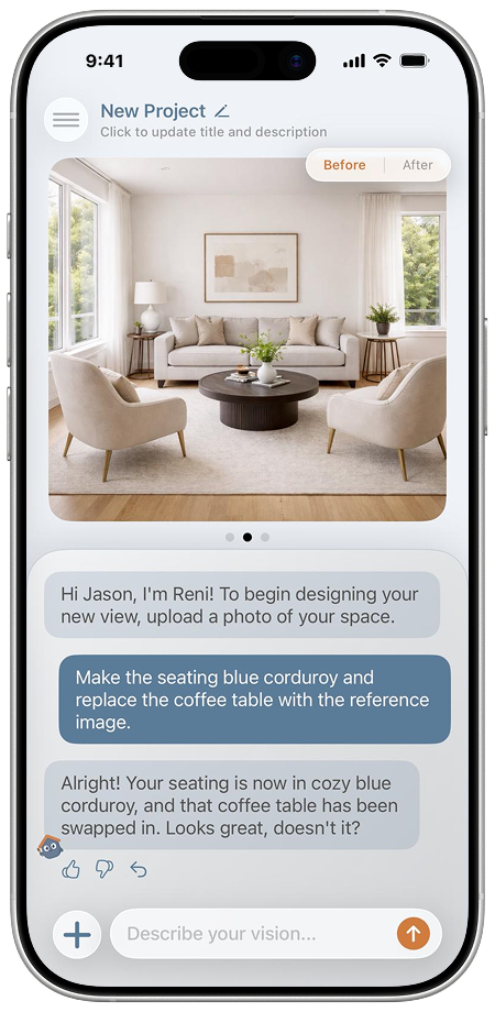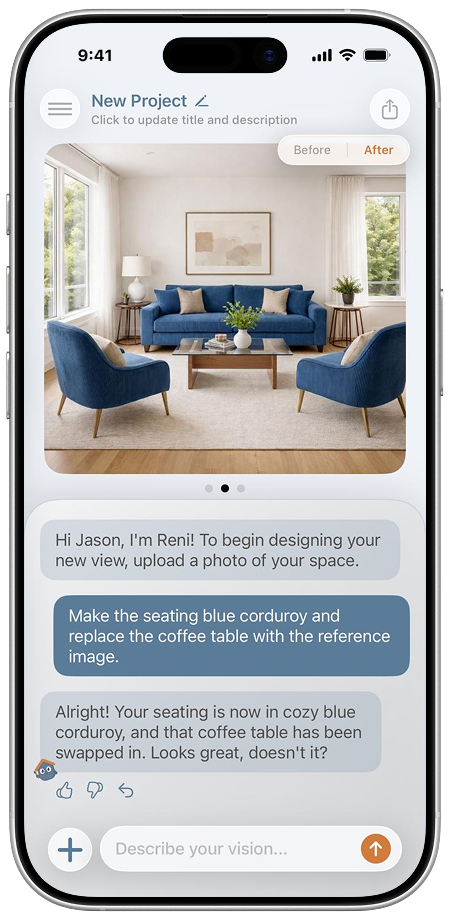 Upload a photo of your space and describe the changes you want. Reni instantly generates realistic visuals based on your room.